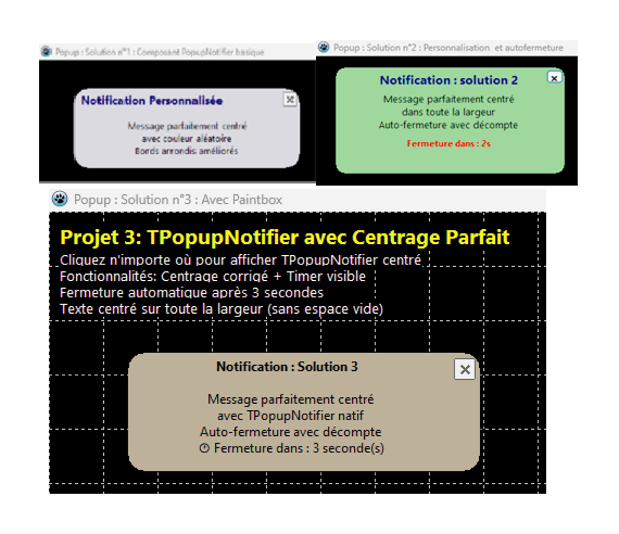 Technique centrale : Utilisation optimisée du TPopupNotifier avec corrections sophistiquées (centrage précis, décompte intégré, bords arrondis) par manipulation des composants internes avec des vérifications de sécurité.